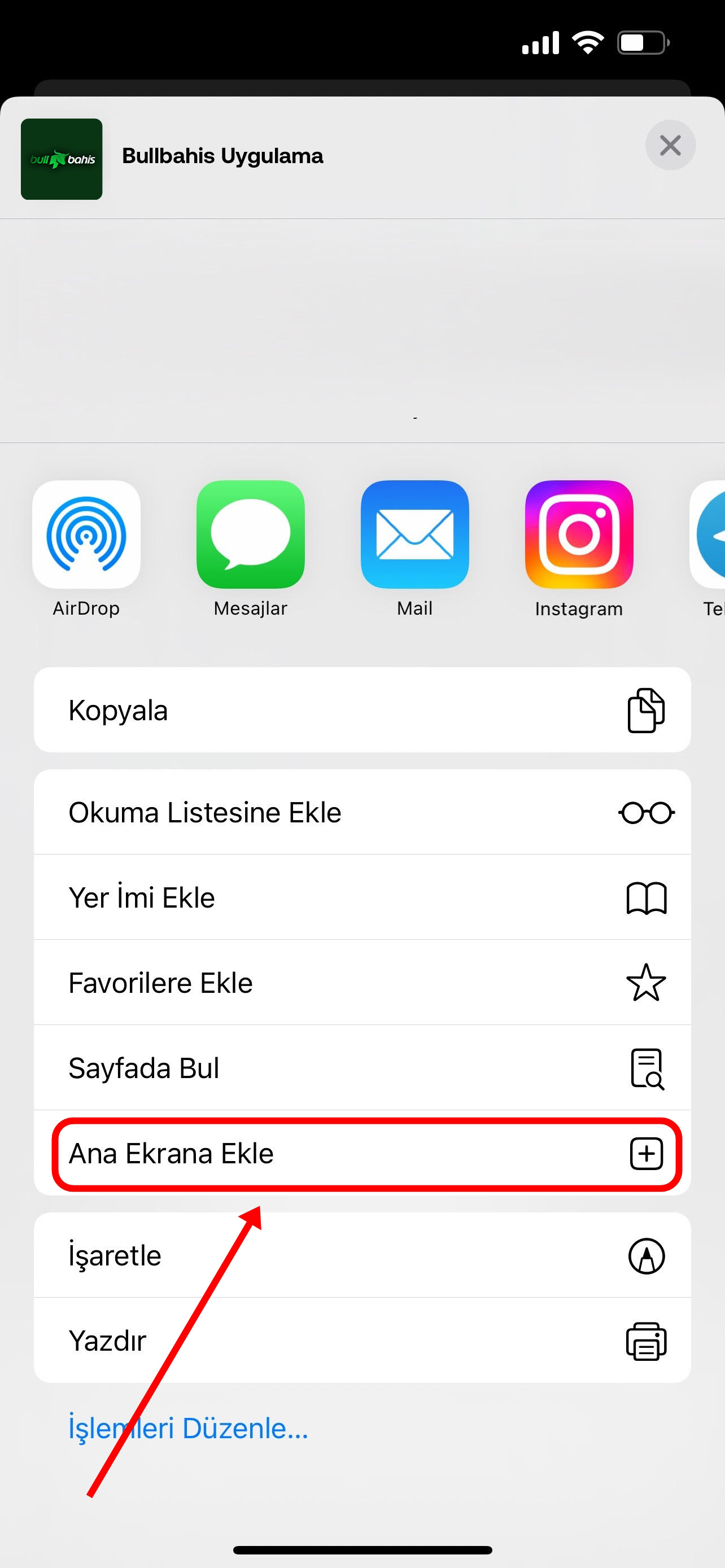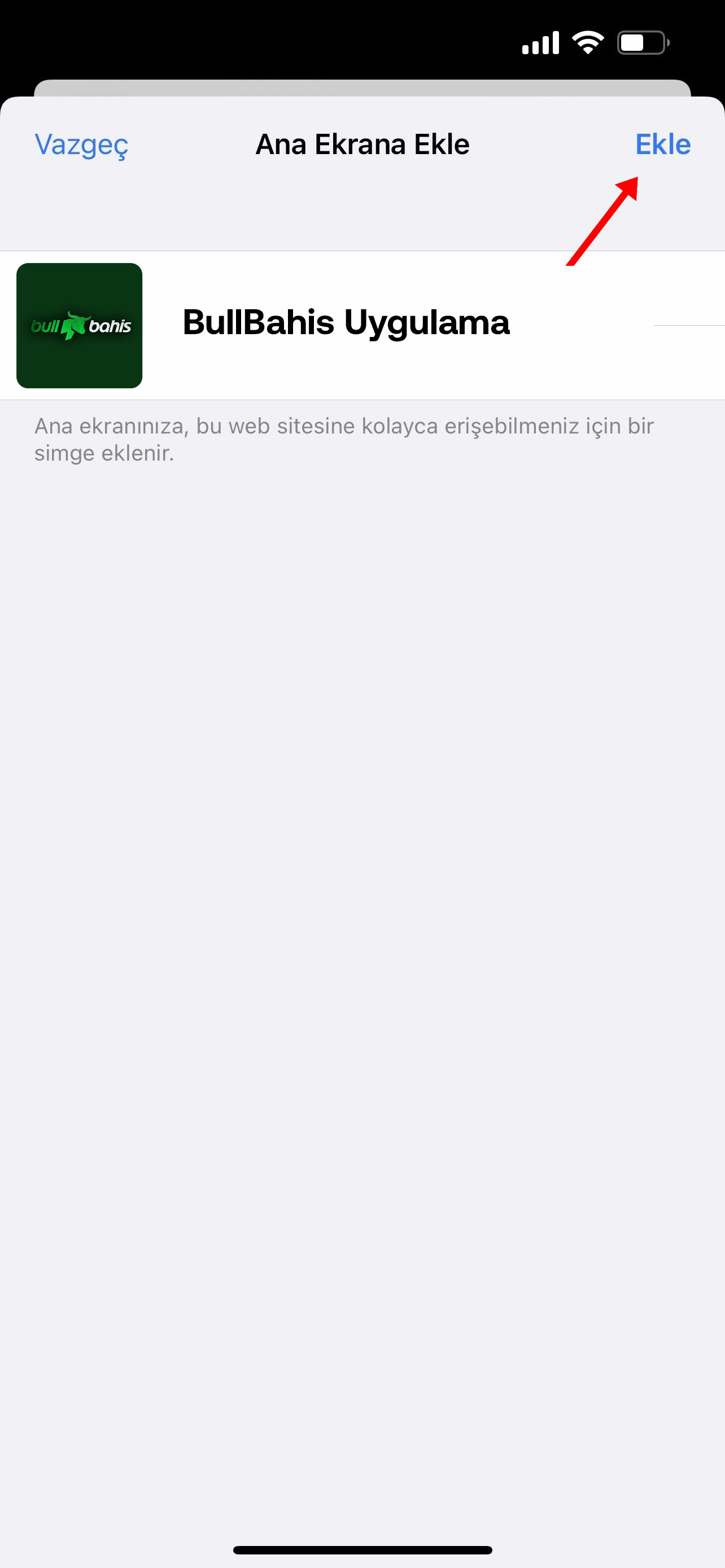 Sağ üstten "Ekle" butonuna tıklıyoruz ve artık siz de BullBahis mobil